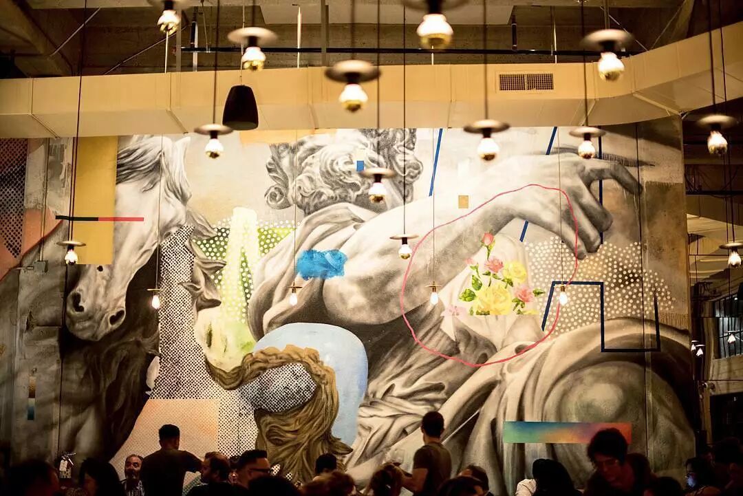 2017年开幕餐厅中最耀眼的色彩来自于 Rossoblu。由世界最屌的街头艺术家 CYRCLE 所绘制的壁画,灵感来源于 Copenhagen’s Relae,不过明显颜色要比欧洲来的鲜艳些。位于 DTLA,Marshall Group 出资打造的这间餐厅拥有180个位子(室内120,室外60),在这个用旧工厂改造的空间里,由各种专业烤炉组成的开放式厨房让人过目不忘,高高的天花板和超级反光的镜子墙壁,将整个空间利用的淋漓尽致。